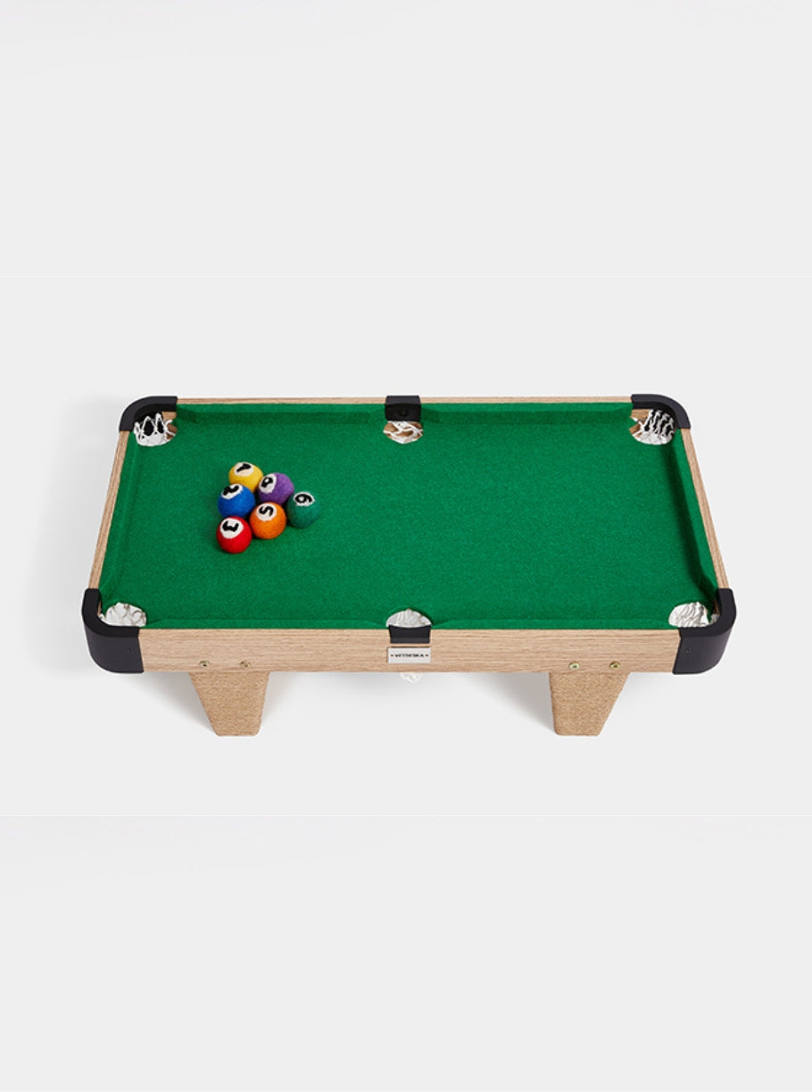 ビリヤード台の爪とぎ、キューに手球がついた猫じゃらし、フェルトの的球を備えた本格的なデザイン。ポケットにはちゃんとボールが落ちる設計になっています。